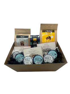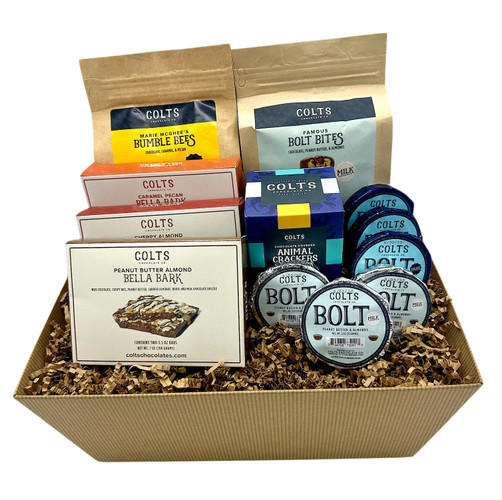 Included in the sampler: one bag of Bolt Bites, one bag of Bumble Bees, six Colts Bolts, one box of animal crackers, and all three varieties of Bella Bark. The chocolates can be all milk, all dark, or an even split!